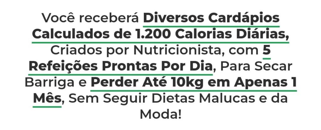 Receba cardápios exclusivos de 1.200 calorias diárias, criados por nutricionista, e perca até 10kg em 30 dias de forma prática, segura e sem dietas loucas!"
